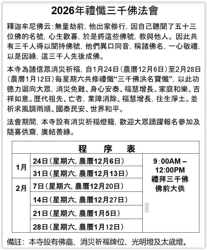 早上法會共修,中午備有素齋與大眾隨喜結緣。歡迎大眾踴躍參加,共結法緣,共成佛道。